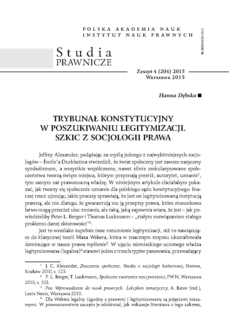 Jeffrey Alexander, podążając za myślą jednego z najwybitniejszych socjologów – Émile’a Durkheima stwierdził, że świat społeczny jest zawsze nasycony symbolizmem, a wszystkie współczesne, nawet silnie zsekularyzowane społeczeństwa tworzą święte miejsca, którym przyznają prestiż, autorytet, uznanie1, tym samym zaś prawomocną władzę. W niniejszym artykule autorka chce pokazać, jak tworzy się społecznie uznanie dla polskiego sądu konstytucyjnego. Inaczej rzecz ujmując, jakie procesy sprawiają, że jest on legitymizowaną instytucją prawną, ale nie dlatego, że gwarantują mu ją przepisy prawa, które stosunkowo łatwo mogą przecież ulec zmianie, ale taką, jaką zapewnia wiara, że jest – jak powiedzieliby Peter L. Berger i Thomas Luckmann – „stałym rozwiązaniem stałego problemu danej zbiorowości”.