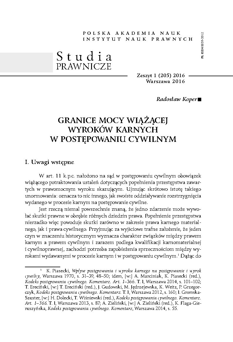 - Piasecki K., Wpływ postępowania i wyroku karnego na postępowanie i wyrok cywilny, Warszawa 1970.