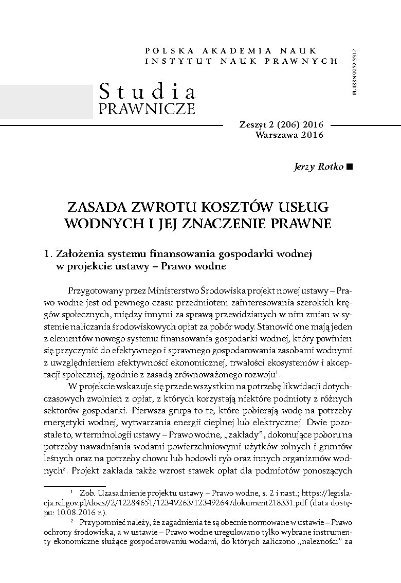 The new draft Act on Water Law provides for significant changes to the system for collecting environmental charges for water use. Their aim is, on the one hand, to eliminate the existing exemptions from the charges and, on the other hand, to increase their rates for those entities that already incur them. The changes to be introduced are justified by the need to ensure that the principle of recovery of the costs of water services, provided for in Article 9 of Directive 2000/60/EC of the European Parliament and of the Council establishing a framework for Community action in the field of water policy, is fully taken into account. Since the principle has not been extensively analysed in the Polish legal literature, the article addresses closely the directions of its interpretations presented in German science. Most of them refer to the dispute between two authors: Herwig Unnerstall and Süleyman Kolcu. In its conclusion, the provisions of the draft Act concerning this principle are assessed on a preliminary basis and the discerned legislative deficiencies are indicated.