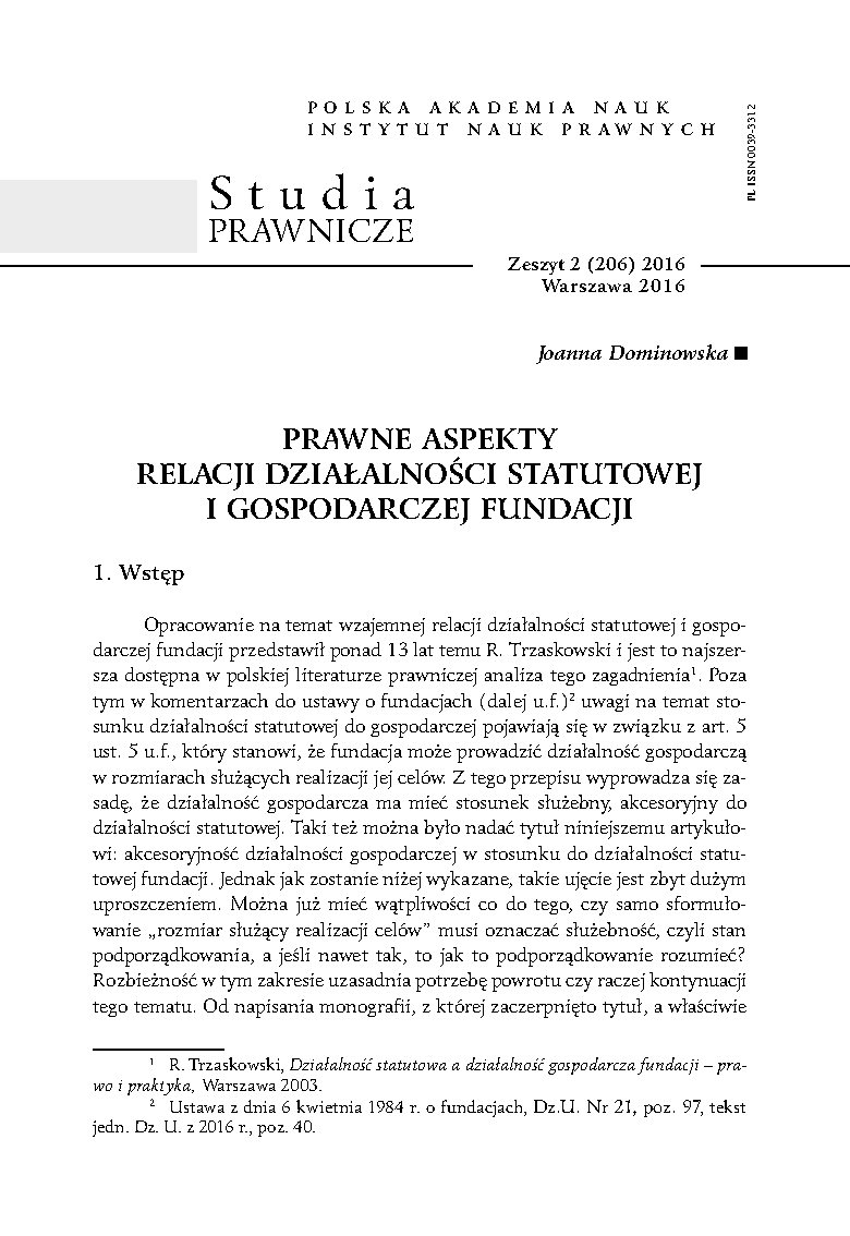 Opracowanie na temat wzajemnej relacji działalności statutowej i gospodarczej fundacji przedstawił ponad 13 lat temu R. Trzaskowski i jest to najszersza dostępna w polskiej literaturze prawniczej analiza tego zagadnienia. Poza tym w komentarzach do ustawy o fundacjach (dalej u.f.) uwagi na temat stosunku działalności statutowej do gospodarczej pojawiają się w związku z art. 5 ust. 5 u.f., który stanowi, że fundacja może prowadzić działalność gospodarczą w rozmiarach służących realizacji jej celów. Z tego przepisu wyprowadza się zasadę, że działalność gospodarcza ma mieć stosunek służebny, akcesoryjny do działalności statutowej. Taki też można było nadać tytuł niniejszemu artykułowi: akcesoryjność działalności gospodarczej w stosunku do działalności statutowej fundacji. Jednak jak zostanie niżej wykazane, takie ujęcie jest zbyt dużym uproszczeniem. Można już mieć wątpliwości co do tego, czy samo sformułowanie „rozmiar służący realizacji celów” musi oznaczać służebność, czyli stan podporządkowania, a jeśli nawet tak, to jak to podporządkowanie rozumieć? Rozbieżność w tym zakresie uzasadnia potrzebę powrotu czy raczej kontynuacji tego tematu.