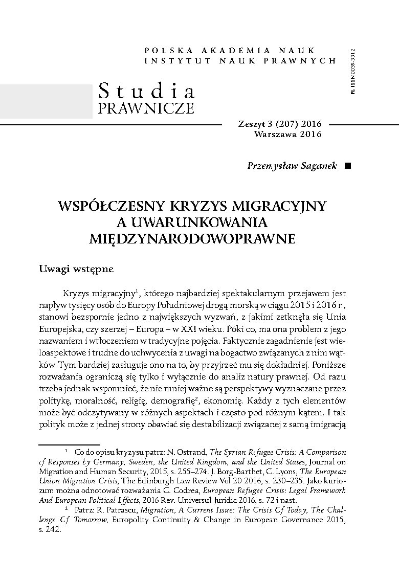 Kryzys migracyjny, którego najbardziej spektakularnym przejawem jest napływ tysięcy osób do Europy Południowej drogą morską w ciągu 2015 i 2016 r., stanowi bezspornie jedno z największych wyzwań, z jakimi zetknęła się Unia Europejska, czy szerzej – Europa – w XXI wieku. Póki co, ma ona problem z jego nazwaniem i wtłoczeniem w tradycyjne pojęcia. Faktycznie zagadnienie jest wie-loaspektowe i trudne do uchwycenia z uwagi na bogactwo związanych z nim wątków. Tym bardziej zasługuje ono na to, by przyjrzeć mu się dokładniej. Poniższe rozważania ograniczą się tylko i wyłącznie do analiz natury prawnej. Od razu trzeba jednak wspomnieć, że nie mniej ważne są perspektywy wyznaczane przez politykę, moralność, religię, demografię, ekonomię. Każdy z tych elementów może być odczytywany w różnych aspektach i często pod różnym kątem. I tak polityk może z jednej strony obawiać się destabilizacji związanej z samą imigracją lub też raczej z reakcją na imigrację (odrodzeniem się nacjonalizmów). Tolerowanie przekraczania granic swojego państwa przez tysiące osób bez żadnej kontroli może traktować albo jako akt szczególnej solidarności zasługujący na pochwałę, albo jako wyraz bezsiły i bezradności czy wręcz zachętę dla innych mocarstw do stymulowania takich ruchów ludnościowych w przyszłości. Z kolei duchowny może traktować obecny kryzys albo jako okazję do okazania miłości bliźniego, albo jako zagrożenie dla samego bytu chrześcijaństwa w co najmniej kilku państwach europejskich czy ich częściach. Autor nie czuje się ekspertem w żadnej z tych dziedzin innych niż prawo, dlatego będą one wspominane tylko w tych sytuacjach, w których ograniczenie się do kwestii prawnych byłoby zupełnie niemożliwe.