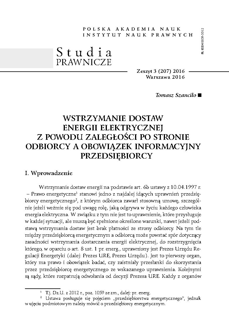 Wstrzymanie dostaw energii na podstawie art. 6b ustawy z 10.04.1997 r. – Prawo energetyczne stanowi jedno z najdalej idących uprawnień przedsiębiorcy energetycznego, z którym odbiorca zawarł stosowną umowę, szczególnie jeżeli weźmie się pod uwagę rolę, jaką odgrywa w życiu każdego człowieka energia elektryczna. W związku z tym nie jest to uprawnienie, które przysługuje w każdej sytuacji, ale muszą być spełnione określone warunki, nawet jeżeli podstawą wstrzymania dostaw jest brak płatności ze strony odbiorcy. Na tym tle między przedsiębiorcą energetycznym a odbiorcą może powstać spór dotyczący zasadności wstrzymania dostarczania energii elektrycznej, do rozstrzygnięcia którego, w oparciu o art. 8 ust. 1 pr. energ., uprawniony jest Prezes Urzędu Regulacji Energetyki (dalej: Prezes URE, Prezes Urzędu). Jest to pierwszy organ, który ma prawo i obowiązek badać, czy zaistniały przesłanki do skorzystania przez przedsiębiorcę energetycznego ze wskazanego uprawnienia. Kolejnymi są sądy, które rozpatrują odwołania od decyzji Prezesa URE. Każdy z organów orzekających, czy to organ administracyjny (Prezes URE), czy sądy (Sąd Ochrony Konkurencji i Konsumentów, Sąd Apelacyjny w Warszawie, Sąd Najwyższy), staje przed koniecznością ustalenia, czy działanie przedsiębiorcy energetycznego było zgodne z prawem, tj. zostało poprzedzone wszystkimi wymaganymi prawem działaniami, w tym, czy został zachowany tzw. obowiązek informacyjny w stosunku do kontrahenta.