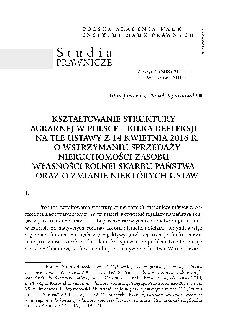 Problem kształtowania struktury rolnej zajmuje zasadnicze miejsce w obrębie regulacji prawnorolnej. W tej materii aktywność regulacyjna państwa skupia się na określeniu modelu relacji własnościowych w rolnictwie i preferencji w zakresie normatywnych podstaw obrotu nieruchomościami rolnymi, a więc zagadnień fundamentalnych z perspektywy produkcji rolnej i funkcjonowania społeczności wiejskiej. Ten kontekst sprawia, że problematyce tej nadaje się szczególną rangę w sferze regulacji normatywnej rolnictwa. W niej bowiem następuje odzwierciedlenie przyjmowanych przez prawodawcę założeń ideowych